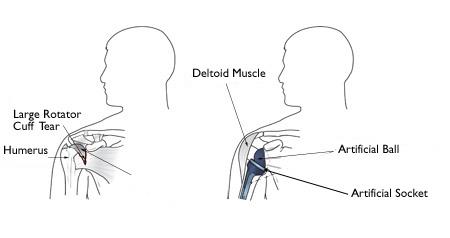 In reverse total shoulder replacement, the socket and metal ball are switched. That means a metal ball is attached to the shoulder bone and a plastic socket is attached to the upper arm bone. This allows the patient to use the deltoid muscle instead of the torn rotator cuff to lift the arm.